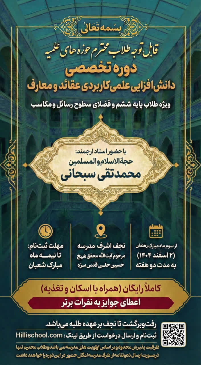 دوره تخصصی «دانش‌افزایی علمی کاربردی عقائد و معارف» ویژه طلاب پایه ششم و فضلای سطوح عالی، با حضور حجت‌الاسلام‌والمسلمین محمدتقی سبحانی در مدرسه مرحوم آیت‌الله محقق شیخ حسین‌علی در نجف‌اشرف برگزار می‌شود.