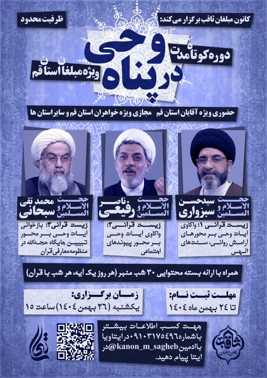 کانون مبلغان ثاقب، دوره کوتاهمدت آموزشی «در پناه وحی» را ویژه مبلغان و استادان برگزار میکند.